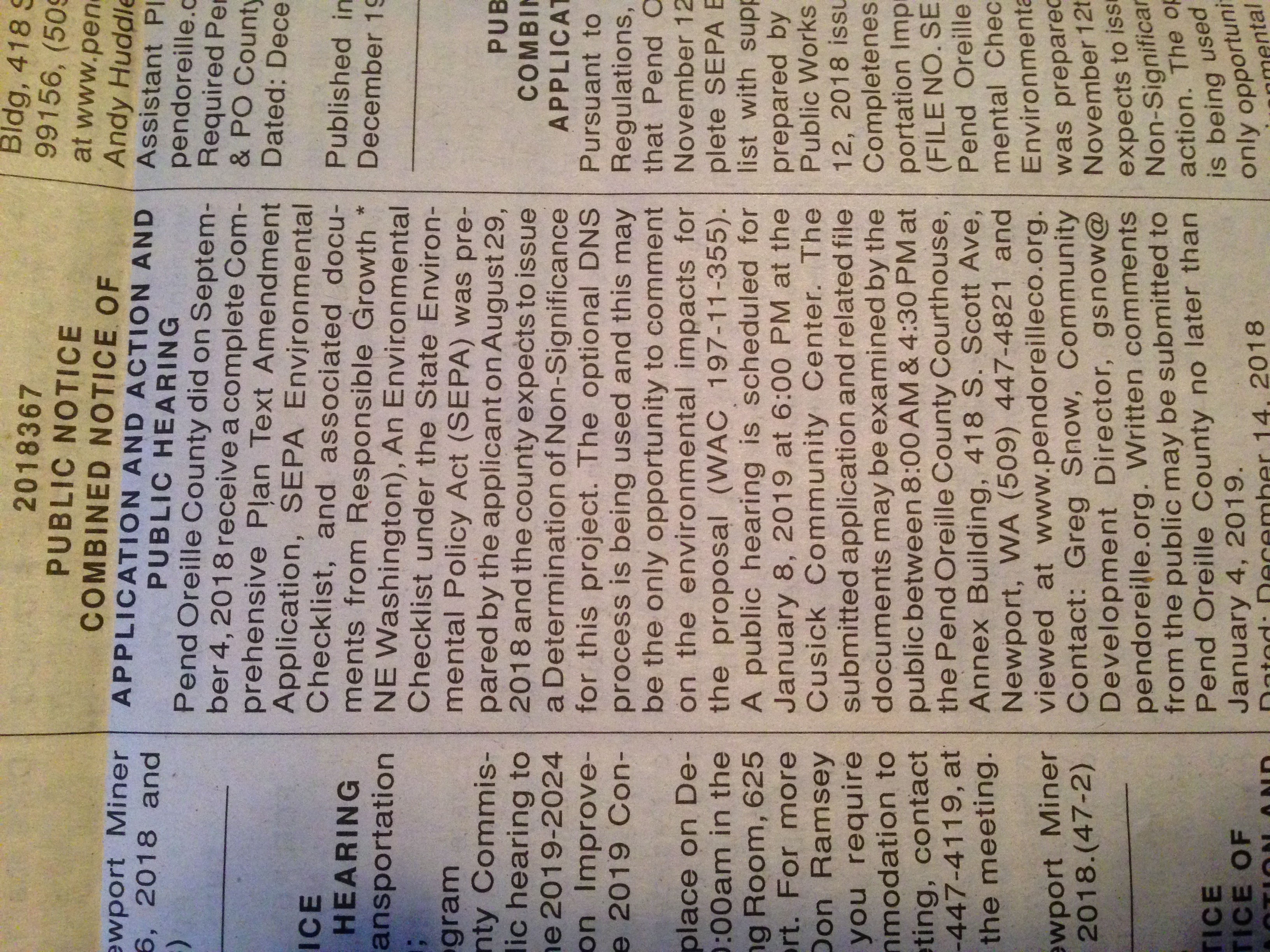 Pend Oreille County Planning Commission will hold a Public Hearing on the Comprehensive Plan Amendments, Tuesday, January 8th, 6:00 pm at the Cusick Community Center.
