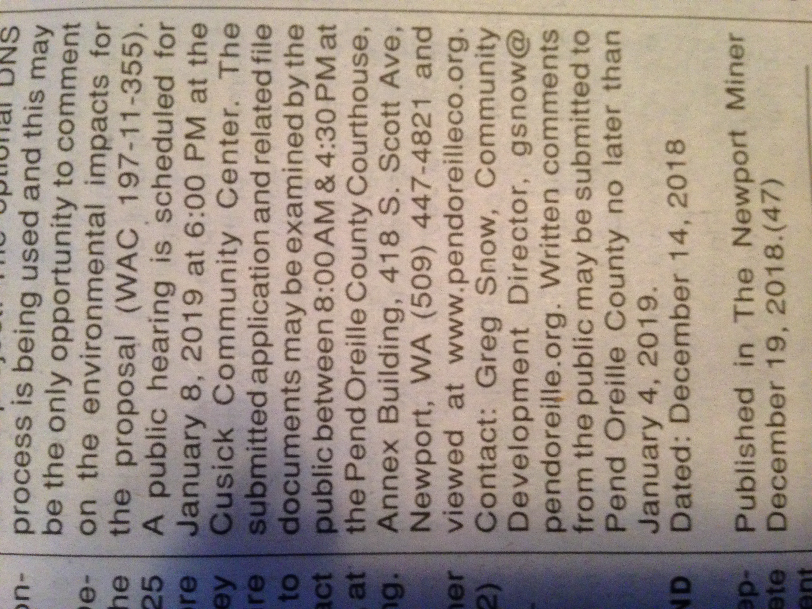 Written comments from the public may be submitted to Pend Oreille County no later than January 4, 2018.