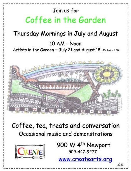 Coffee in the Garden hosted by Create Arts Center are held every Thursday morning in July and August from 10am – Noon. Artist in the Garden dates are July 21 and August 18, 10am – 1pm.